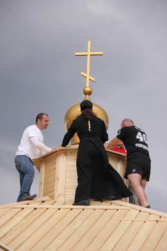 Строительством занимались молодые и крепкие мужчины из православных общественных движений «Общее дело» и «Сорок сороков», чьи белые, красные и черные футболки с соответствующей символикой то и дело мелькали на строительной площадке. За считанные часы из ничего, на абсолютно пустом месте и почти голыми руками был поставлен дом Божий, и как радостно, как необыкновенно таинственно и в то же время спокойно, без суеты все это произошло…