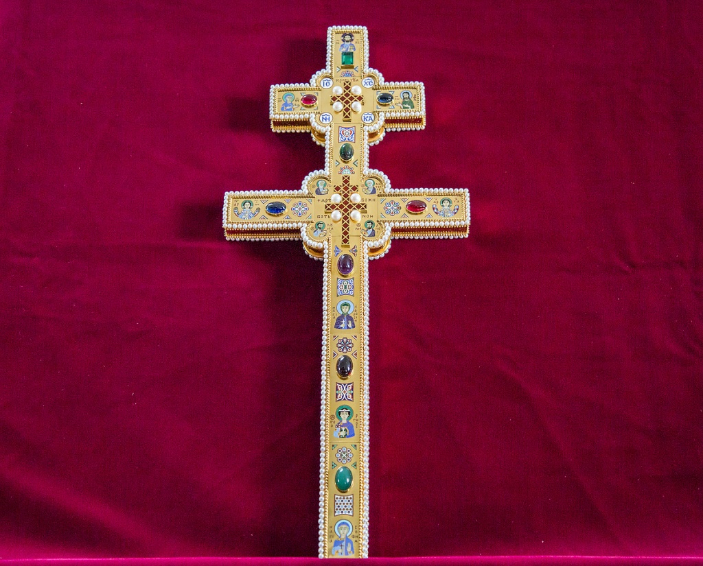 Это крест восьмиконечный, на котором табличка и подножие ног распятого Спасителя особо выделены (вопреки расхожему мнению, наклон подножия ног Христа не обозначает разную вечную участь распятых с Ним разбойников, а связан с изображением в ракурсе).