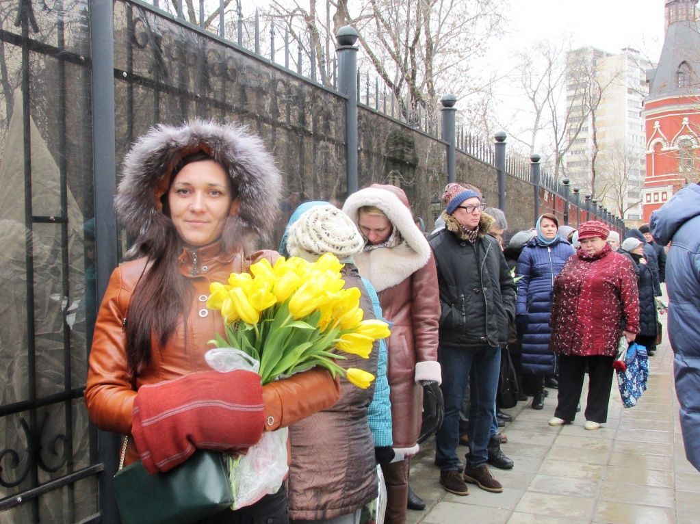 Многие приезжают целыми группами из других городов. Люди стоят здесь в будни и в праздники, в жару и в холод, под дождем и снегом. Пожалуй, нет в Москве более длинных очередей к святыням, и вряд ли другой святой или святая получает столько цветов, сколько Матронушка. Тысячи людей разного пола и возраста приносят любимой святой столько цветов, что если их разложить по периметру монастыря, то он будет обрамлен сплошной цветочной рамкой.