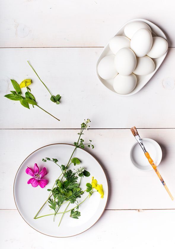 Нам понадобятся: яйца, сваренные вкрутую, клей для поделок (или нетоксичный универсальный клей), зелень, листья, цветы, кисть для рисования.
