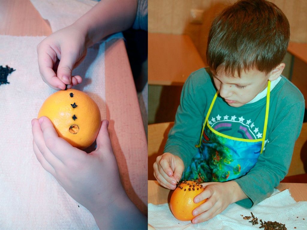 1. Используйте гвоздику для нанесения узоров на апельсин, можно сделать прямые линии, красивые завитушки и даже сердечко.