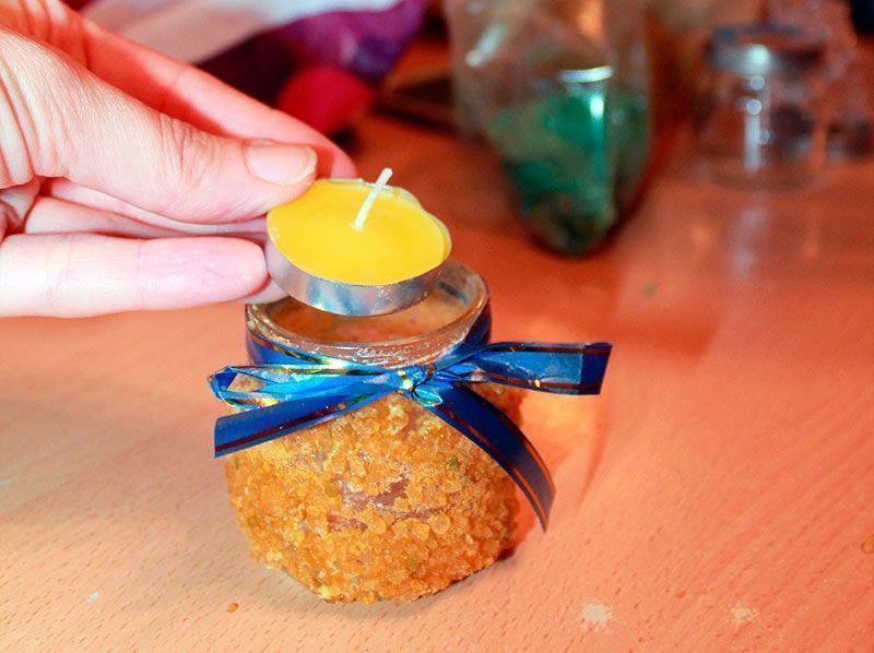 3. Украшаем горлышко атласной ленточкой, вставляем свечку и зажигаем.