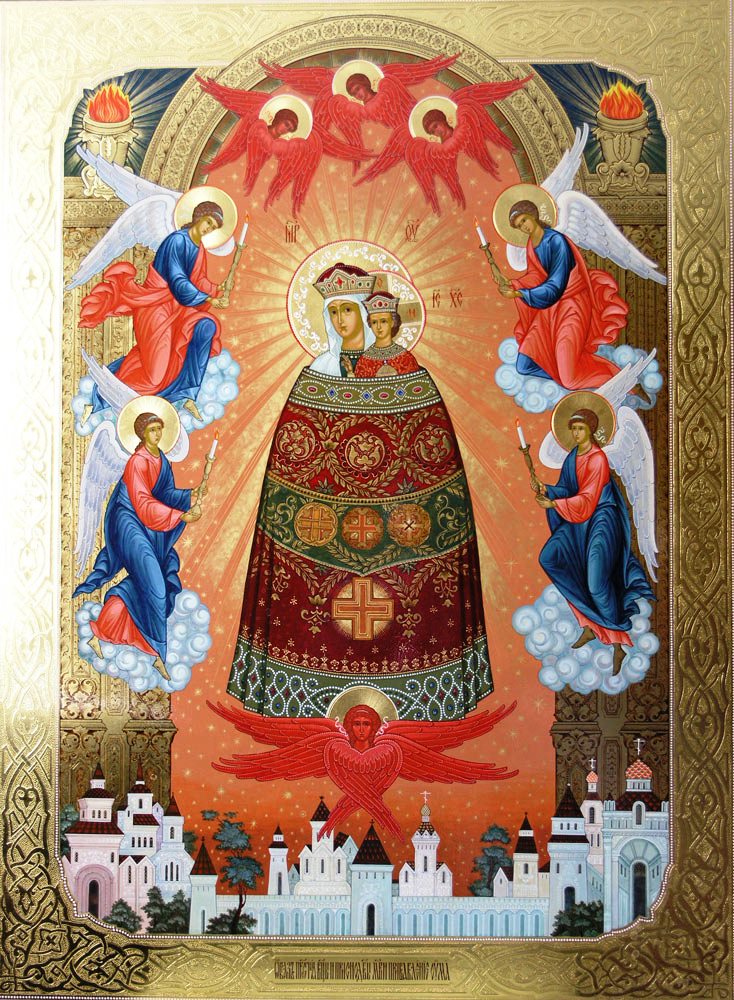 Ясно, что вряд ли можно было встретить такой образ в храмах Центральной России. Известные иконы Богородицы «Прибавление ума», на которых изображены Богородица и Предвечный Младенец, облаченные в колоколоподобный далматик, скрывающий их руки, появились в России в XIX веке. Они и сейчас обретаются в храмах и домах города Тутаева.