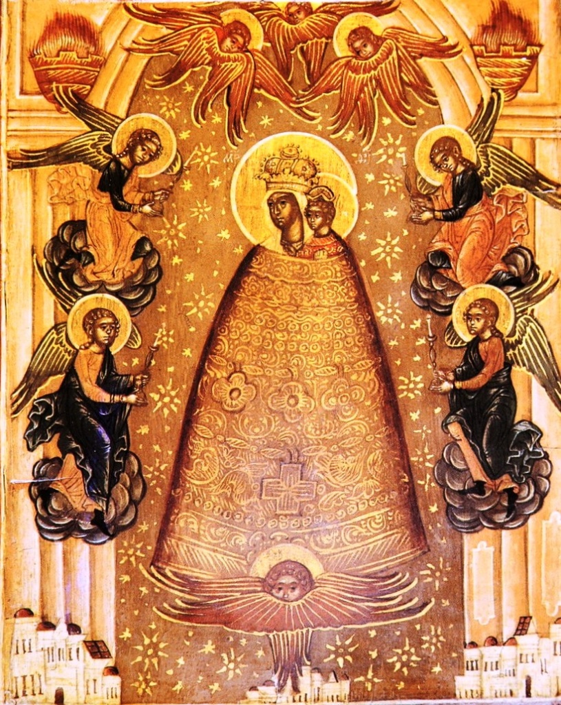 Представленное изображение символизирует фрагмент праздничного архиерейского богослужения. Ангелы по обеим сторонам, протягивающие большие горящие свечи, – прообразы диаконов с диаконскими свечами. Херувим в ногах Богородицы с Младенцем Христом – орлец в ногах архиерея. Столь сложная композиция должна была объясняться неким иконографическим сюжетом, послужившим для ее изображения.