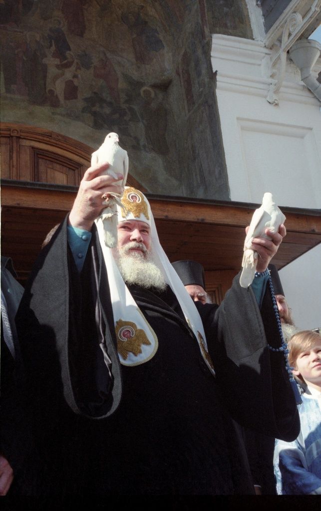 Снимок, о котором мы говорим, был сделан 7 апреля 1998 года. За год до того тоже получился хороший кадр, но там не было динамики: здесь всем понятно, что птица взлетает, у нее даже крылышки немного смазаны, а на снимке 1997 года Патриарх просто держит двух голубей, подняв вверх руки. Его тоже перепечатывали различные издания, но тот снимок, что сделан в 1998-м, известен больше всех.