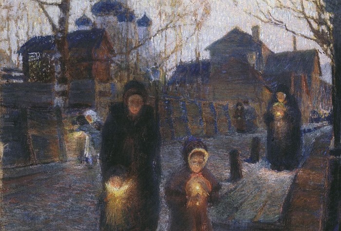 Выходили мы в полумраке, не пивши чаю, шли с моей старушкой по темным улицам. Таинственно и прекрасно. Душа полна радостью, точно делаешь что-то хорошее… В церкви народу мало, но как-то особенно значительно раздаются моления и испытываешь особенное молитвенное настроение…