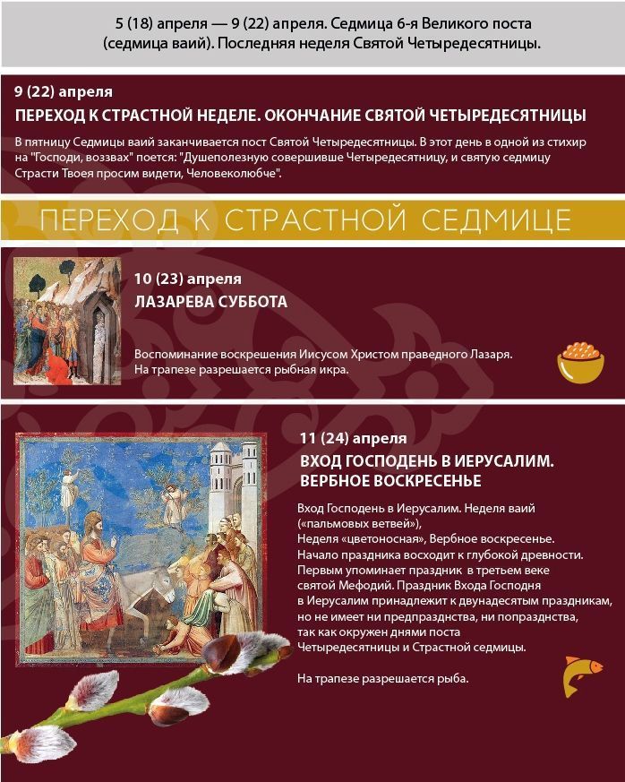 Завершается Святая Четыредесятница, и мы вспоминаем о том, как в преддверии святых и спасительных страстей, смерти на кресте и трехдневного Воскресения Спаситель совершает воскрешение человека, который четыре дня пробыл в могиле, ‒ своего друга Лазаря. Это событие воспоминается в субботу шестой седмицы Великого поста.