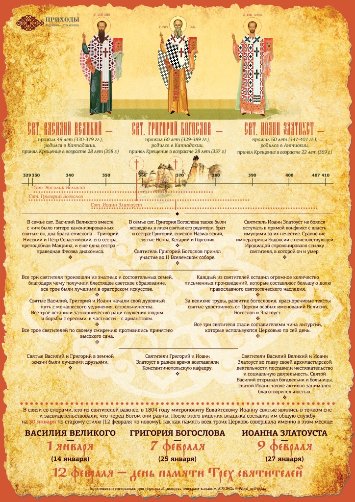 12 февраля Церковь празднует память вселенских учителей и святителей Василия Великого, Григория Богослова и Иоанна Златоустого. Кто были эти святители, как они были связаны в жизни, что у них общего? Почему они удостоились особых именований – Великий, Богослов, Златоуст? По какой причине память этих отцов Церкви празднуется в один день?