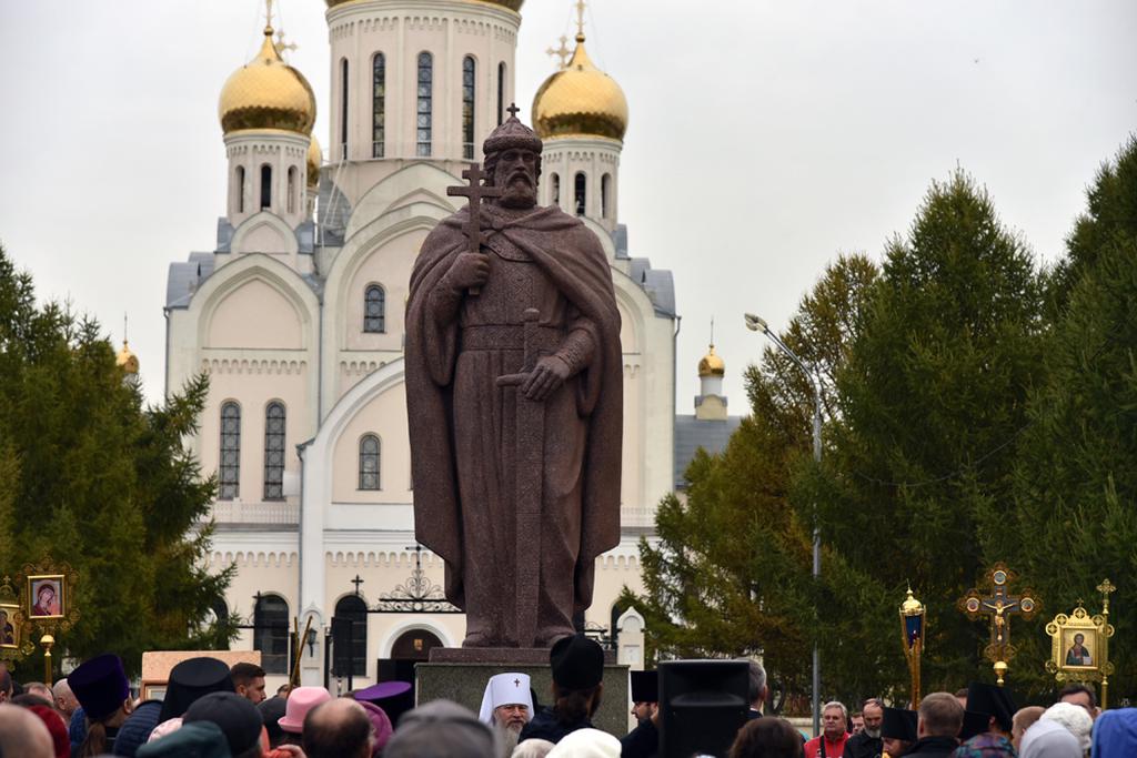 Памятник святом Крестителю Руси установлен на территории Знаменского кафедрального собора столицы Кузбасса. Интересно выбранное художественное решение: святой держит в руке крест и попирает ногой языческого идола.