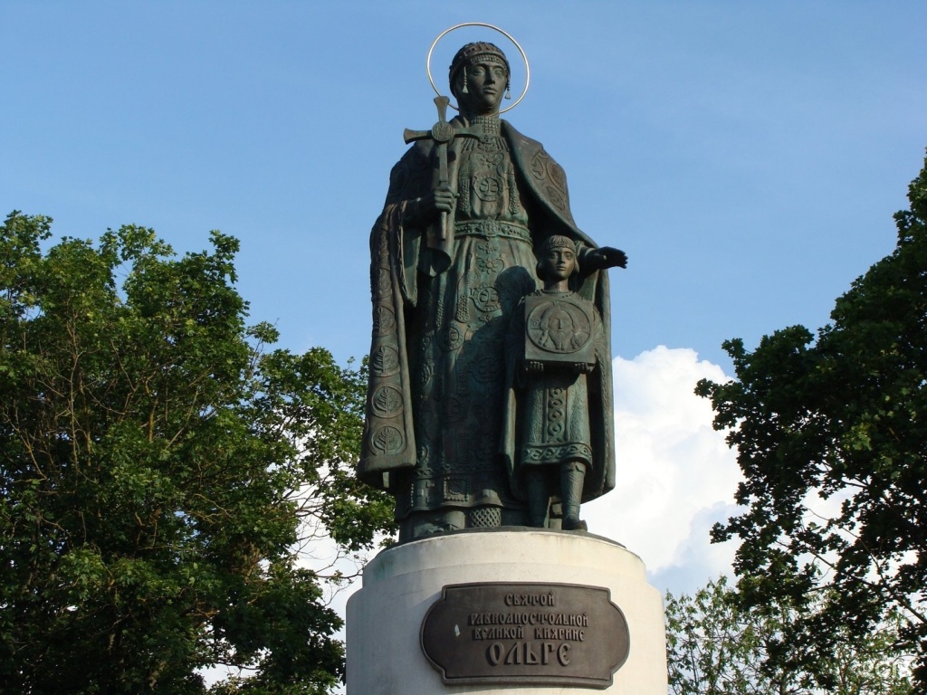 Как такового памятника святому Владимиру во Пскове нет, но можно увидеть памятник равноапостольной княгине Ольге – уроженке этих мест и бабушке Крестителя Руси. Однако подойдем к этому монументу – тут мы сможем увидеть бронзовую фигуру княгини с мальчиком, ее внуком князем Владимиром, держащим в руках икону с ликом Христа.