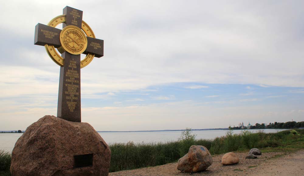 В городе не увидишь на постаменте скульптуру князя Владимира Красно Солнышко. Но есть в тех местах, на берегу озера Неро, памятный знак, непосредственно связанный с этим святым. Поклонный крест установили в память о крещении великим князем Владимиром в водах озера жителей Ростова в 991 году.